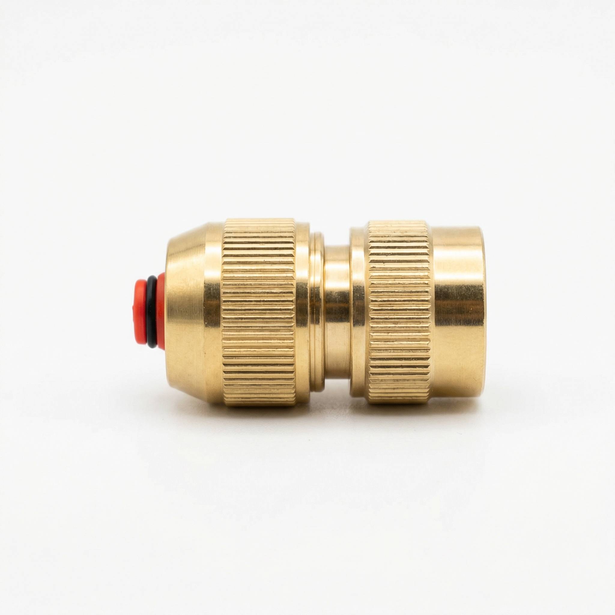 This brass shut off hose connector shuts off when disconnected. Designed to be compatible with popular brands of hose snap connectors.
