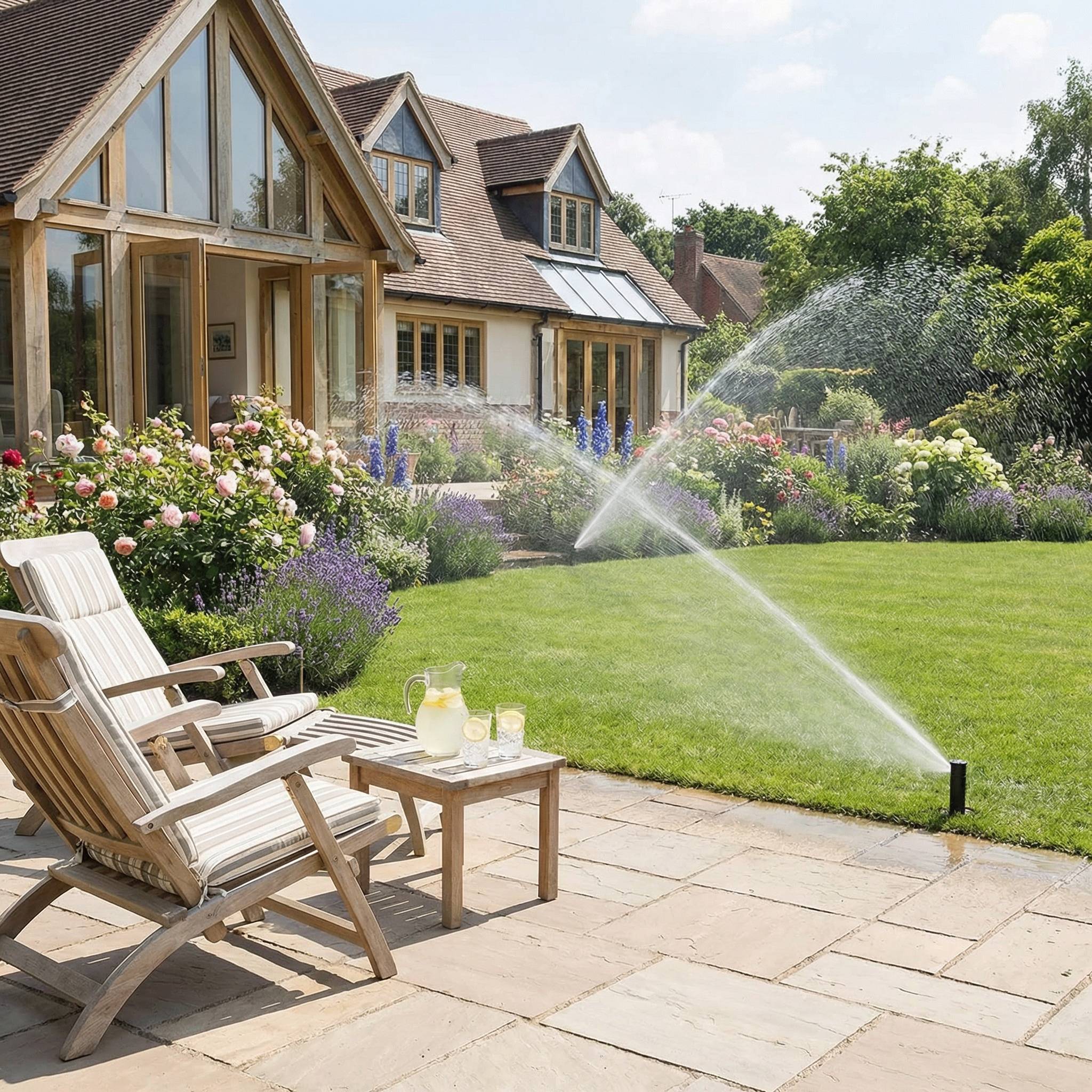 Nothing looks better in the garden than a lush, green well watered lawn. Regular watering also ensures the grass stays in good condition even during times of warm weather and heavy usage. With a pop up lawn sprinkler system everything is hidden under the lawn with the sprinklers rising out of the lawn when watering. Watering is normally done very early in the morning before the grass is being used.