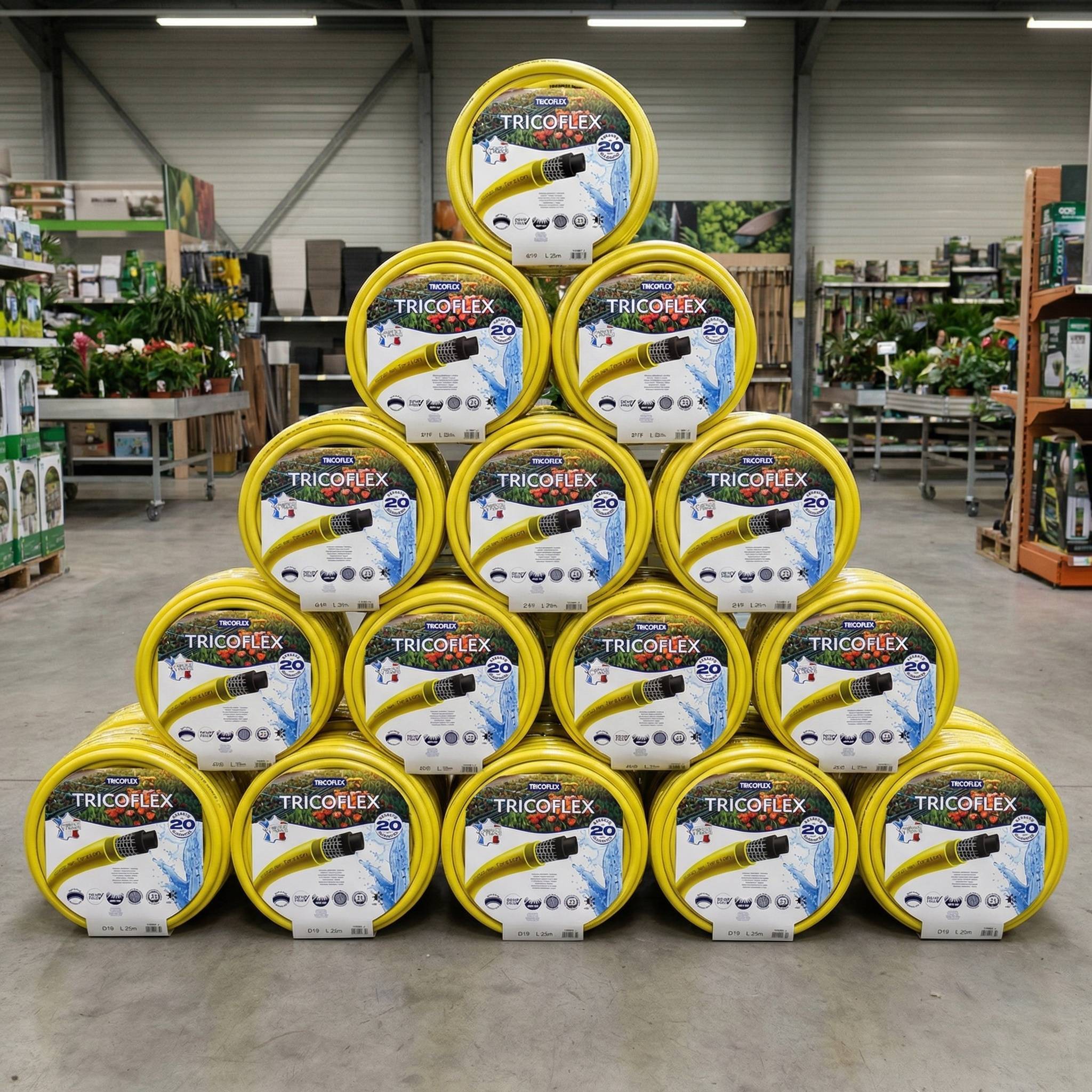 Manufactured by Tricoflex in the Champagne region of France, Tricolex is regarded as the best quality hose for commercial horticulture and is found in garden centres, nurseries, market gardens, farms, vegetable growers and on construction sites. The 19mm Tricoflex hose uses the companies Non-torsion technology for superior performance.
