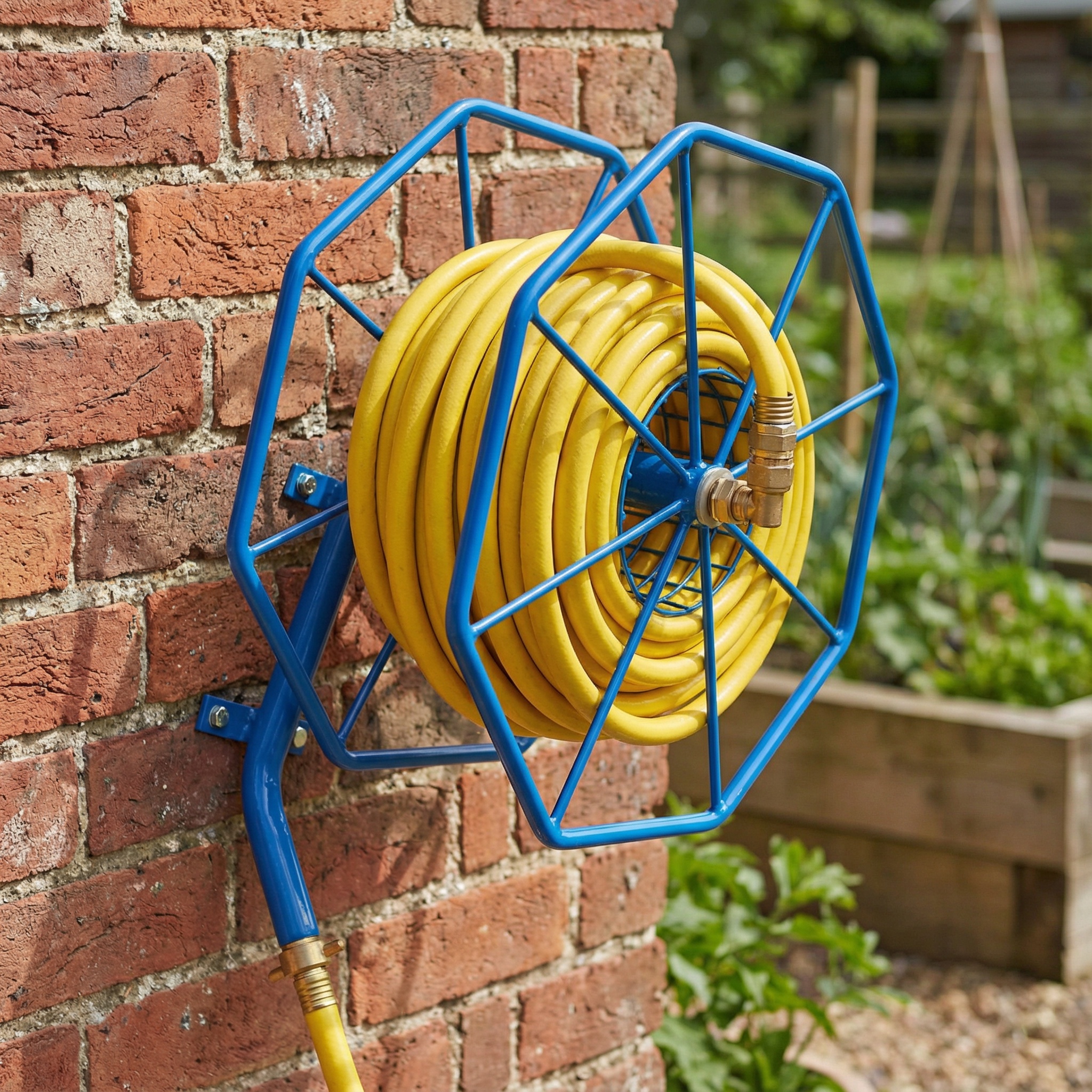 The welded steel heavy duty wall mounted hose reel is fully powder coated with a blue polyester powder coating and is manufactured in the UK.