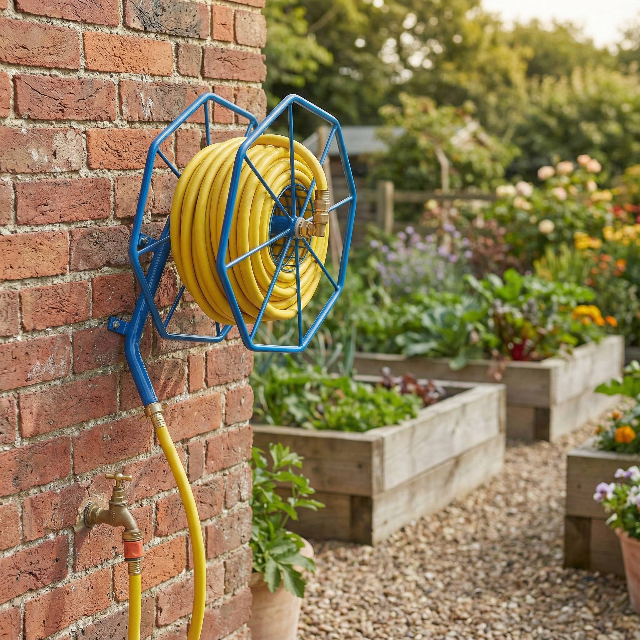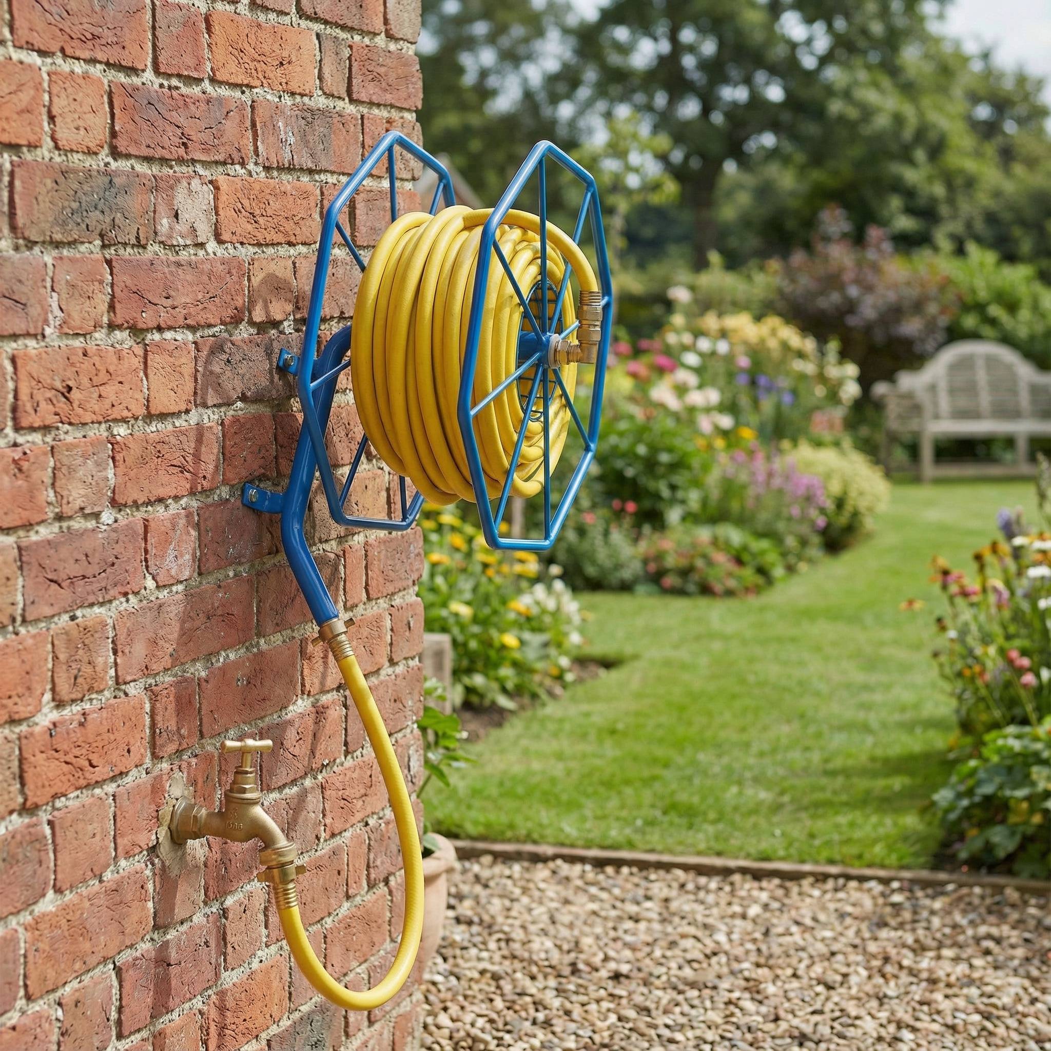Heavy duty wall mounted hose reel manufactured from welded steel with 1/2″ inlet connector and brass quick connector. Designed for 12.5mm or 19mm irrigation hosepipes allowing watering and irrigation to take place.