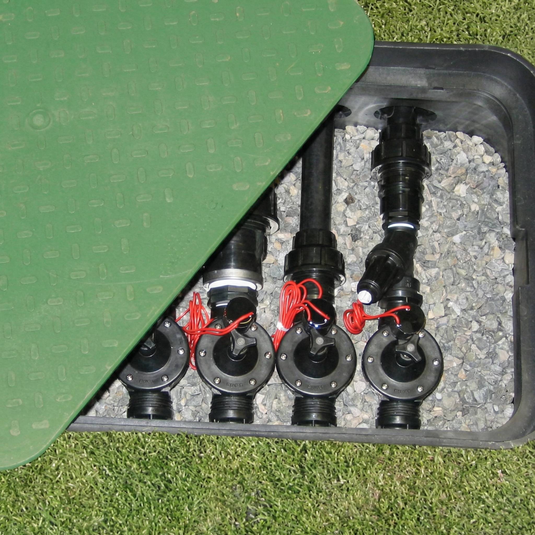 Locating the irrigation valves in and underground chamber provides a neat solution for garden watering, with all of the unsightly valves and pipes hidden from view. With a green lid, the irrigation valve box can be located either in the lawn are or in a flower bed.