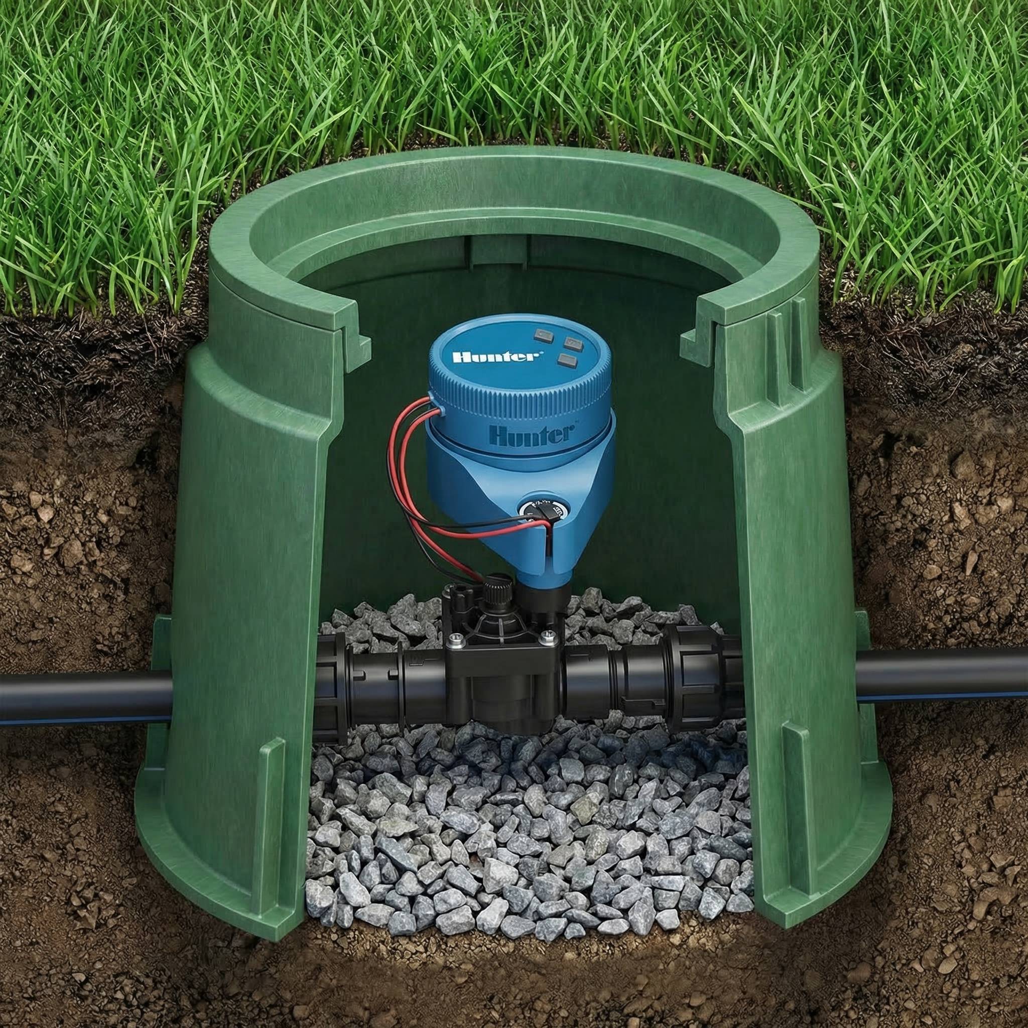 - Mounts to Hunter solenoids, pipes, flat surfaces, or inside the valve box
