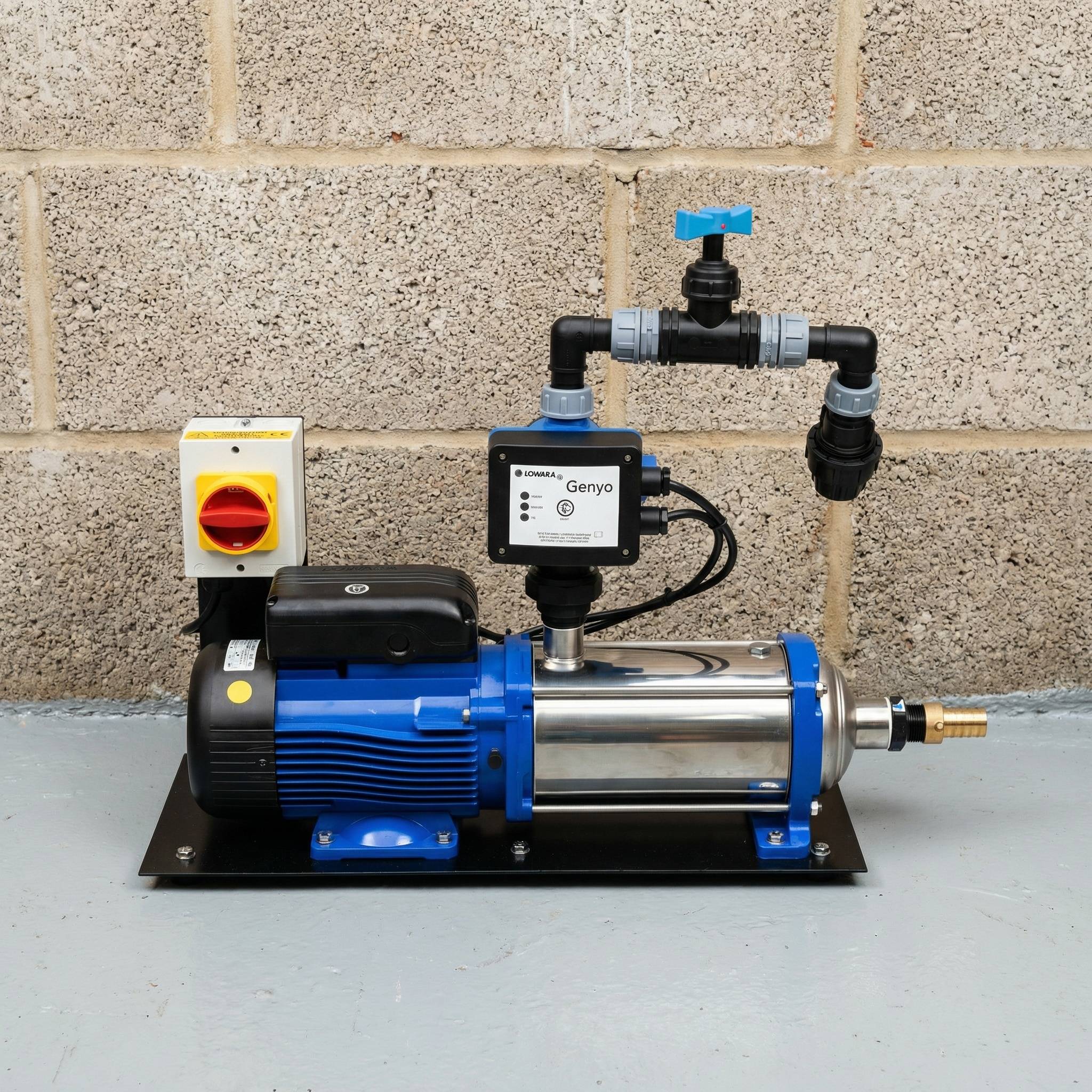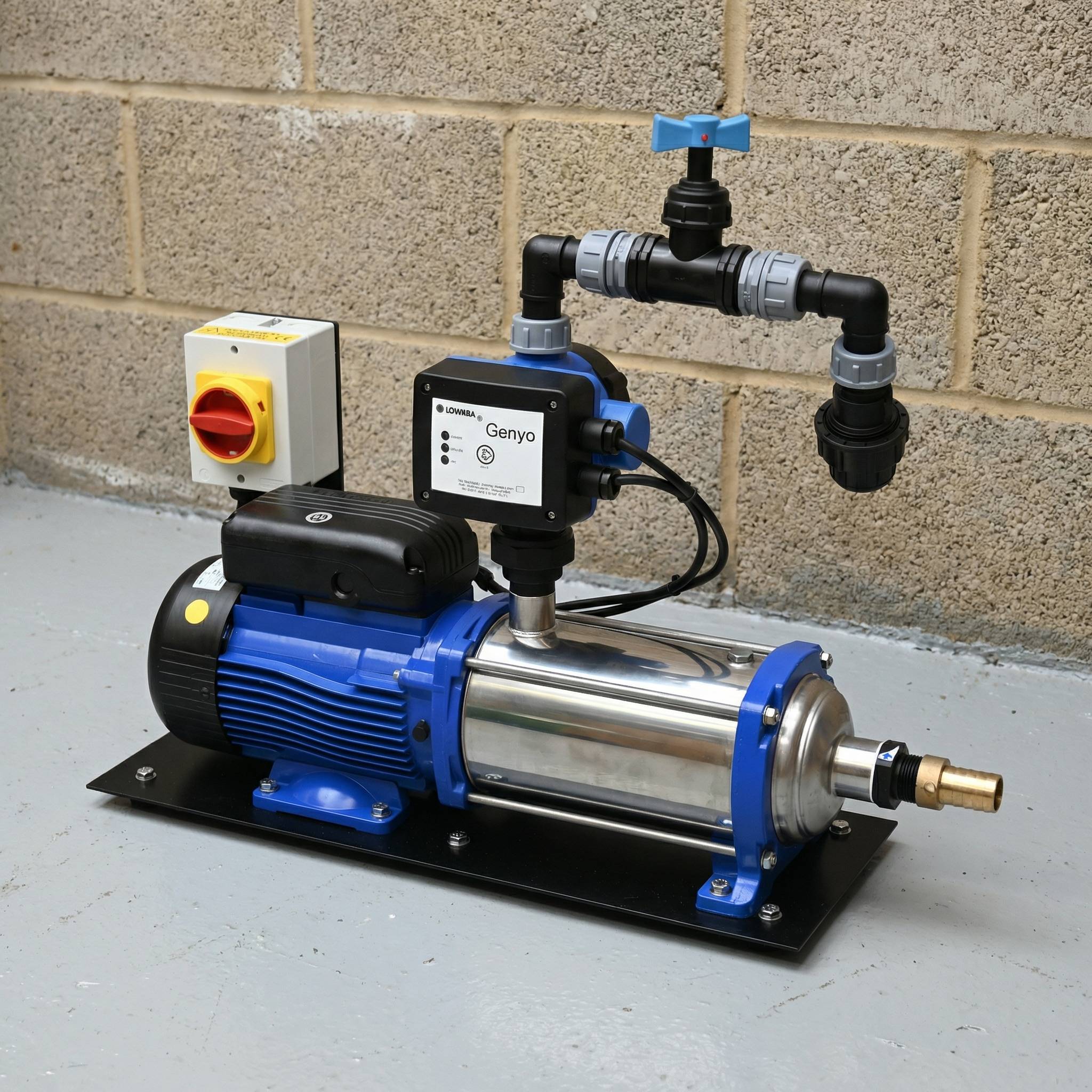 The pre-assembled pump unit is prefabricated for easy pump installation the pump and is supplied mounted on a plate and pre-wired with a Genyo auto-start unit and to an isolator switch. The auto-start unit brings the pump on as soon as a drop is pressure is detected. Includes 2m of suction hose with 1” BSPF fittings to connect to an irrigation tank outlet.