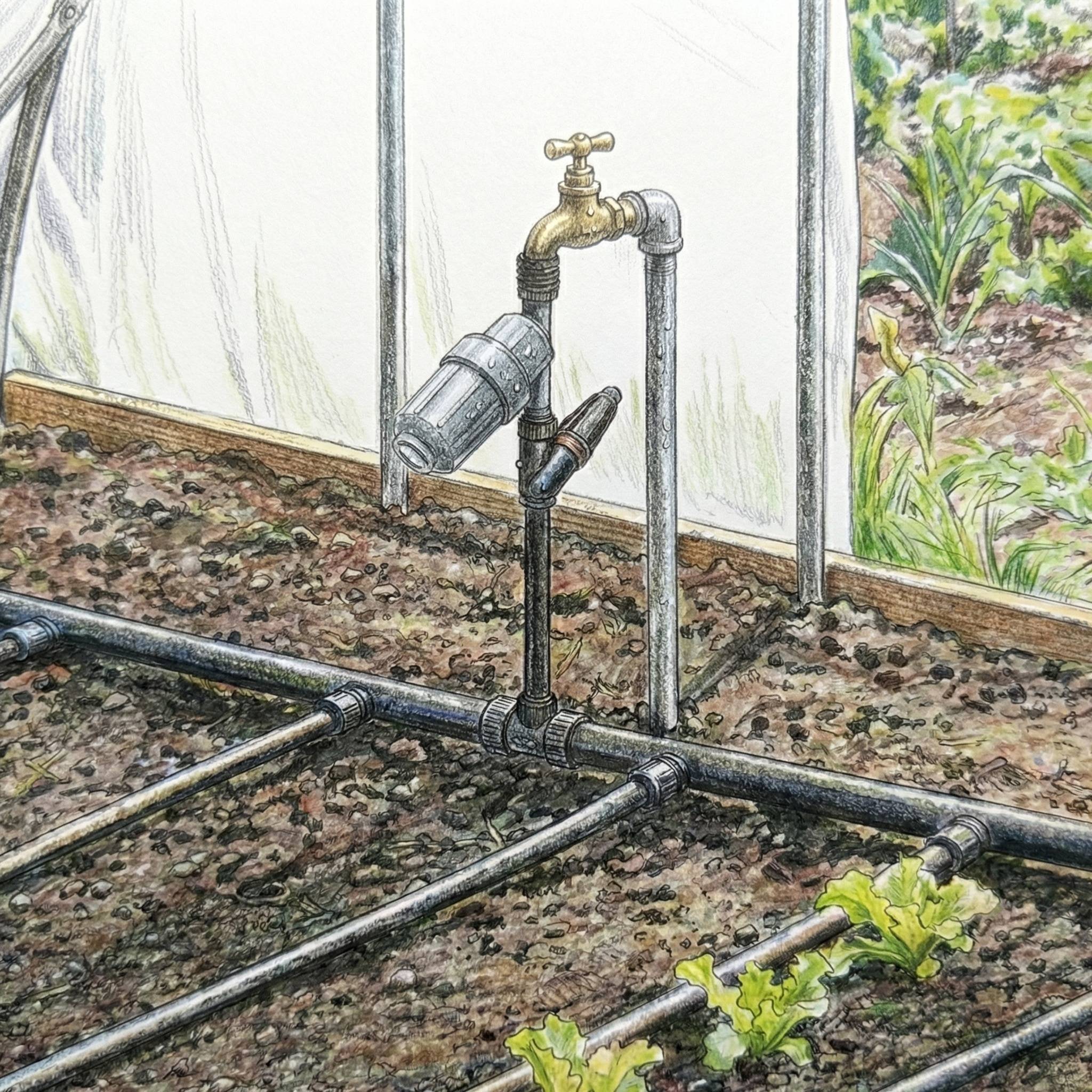 Starter pack with pressure regulator and filter for making up T-Tape glasshouse systems