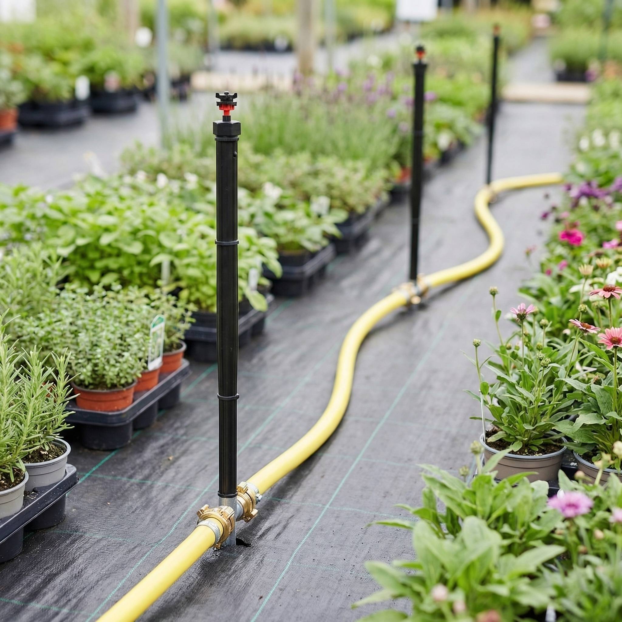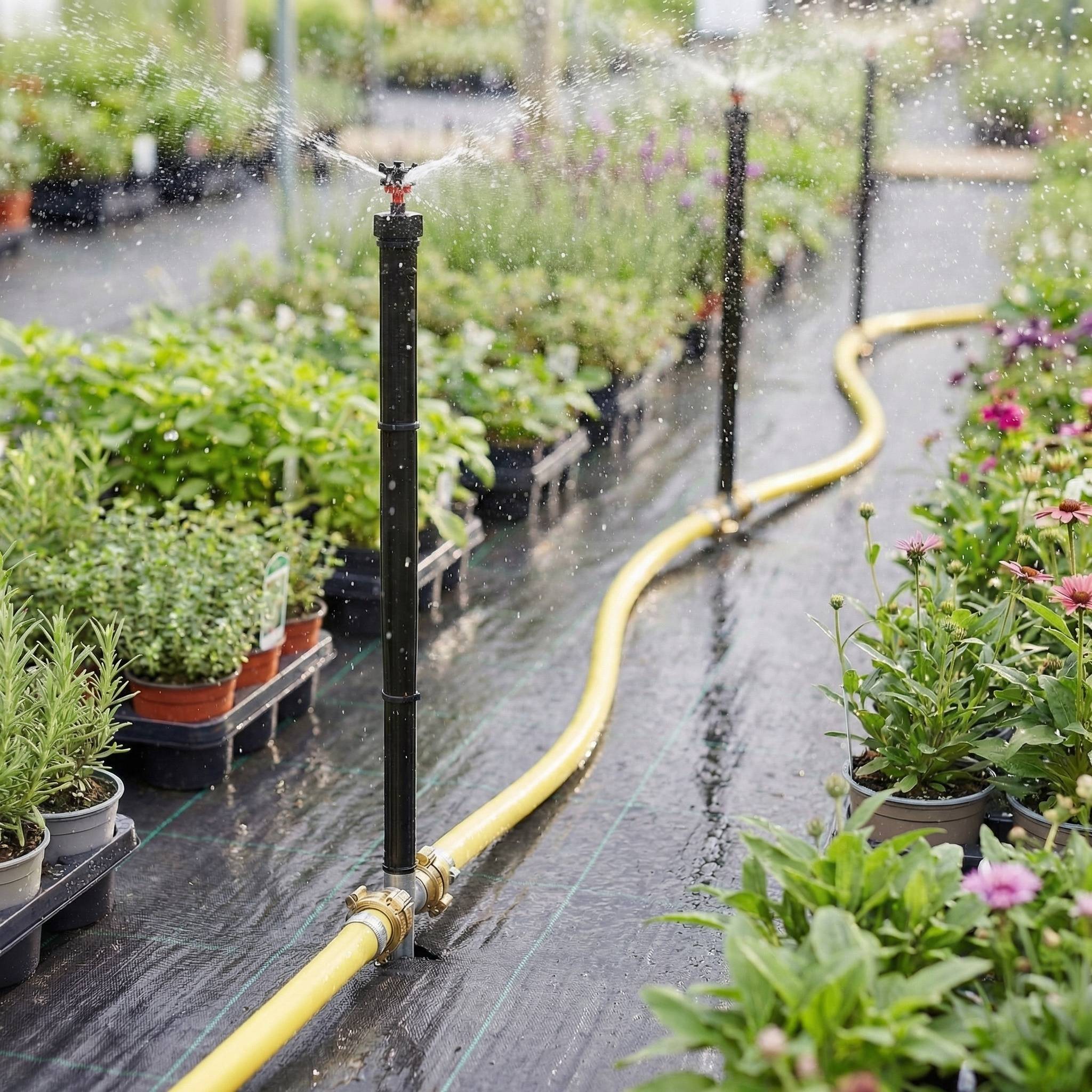 On nursery installations choose the geka type sprinkler and use hose to link the sprinkler runs. Generally the Mini spin sprinklers will be spaced 2.0m to 2.5m apart down the run.
