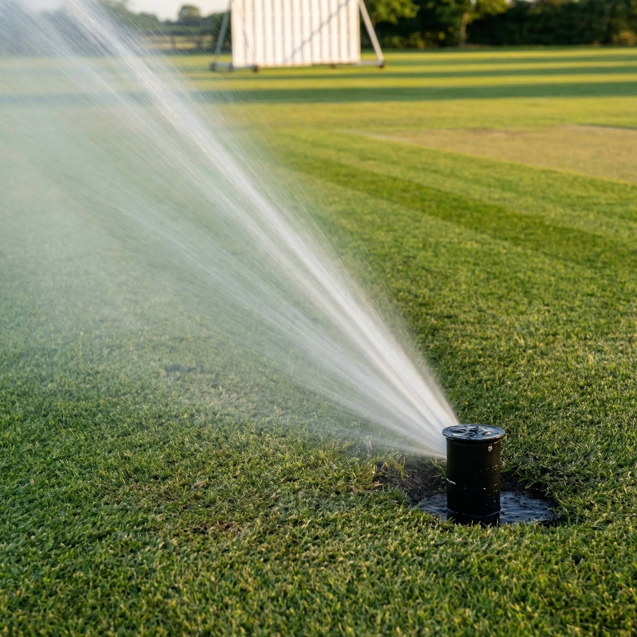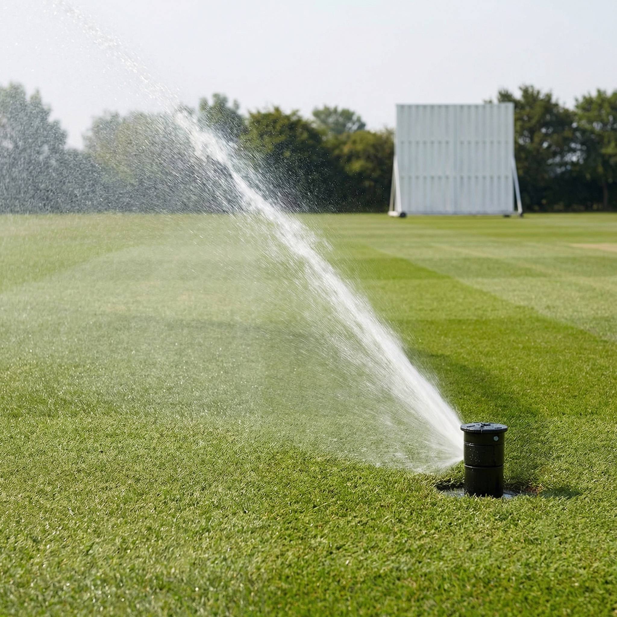 One sprinkler is located on each side of the 30m x 30m cricket square, buried into the ground so that only the small head of the sprinkler is exposed. Each sprinkler waters a 180 degree arc, ensuring even coverage of the entire square. One sprinkler operates at a time and can be programmed to automatically water during the night when evaporation levels are at their lowest. A unique feature of the Rainbird sprinkler is the ability to manually over-ride the sprinkler setting so that the sprinkler can water in a 360 degree arc. This allows some of the outfield to be watered as well.