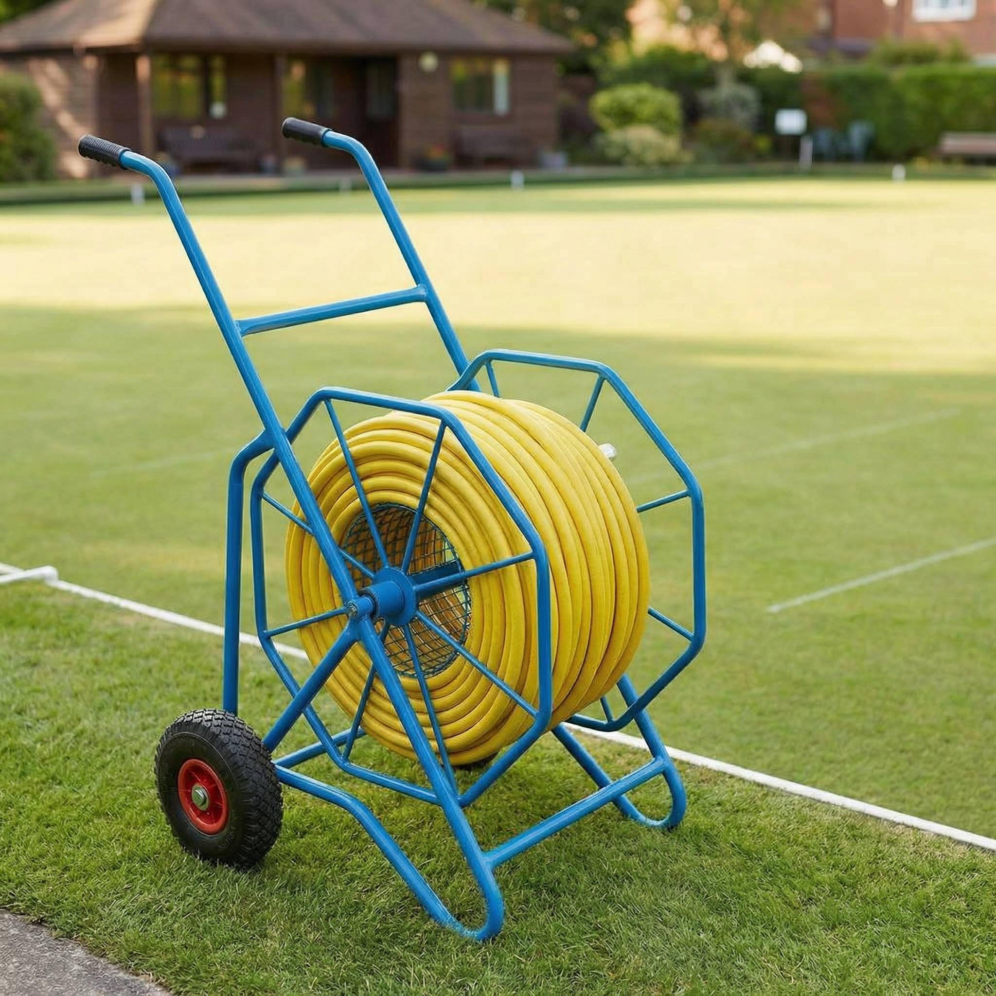 The watering package consists of 4 sprinklers which will water a 40m x 10m strip each night, a battery timer to automate the watering, hose to run to the tap from the edge of the green (up to 25m from the green) and a hose trolley. Each afternoon the sprinklers can be set up and connected to the water supply. The timer can be preset to bring the sprinklers on during the night when the evaporation rates are at their lowest, allowing full use of the pitch during the day.