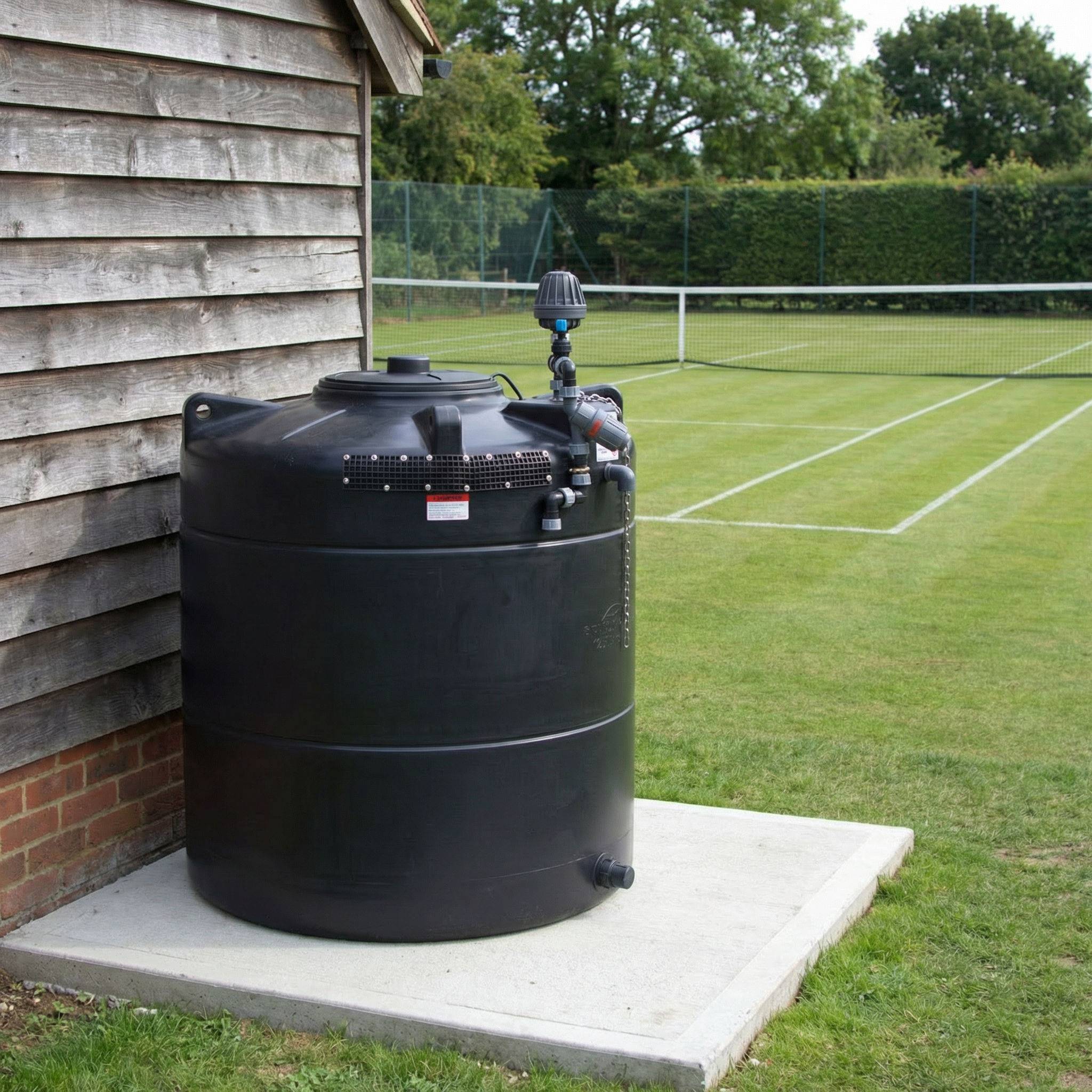 The pressures and flows involved mean that a 1250 litre water storage tank and pump unit are included to operate the system. The pump and tank complies with UK Water Regulations. An automatic controller will allow early morning watering to ensure the court remains playable during the day. The controller can be upgraded at additional cost to allow wi-fi connection and enhanced weather sensitivity.